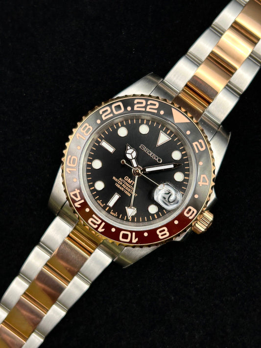 4-hand NH34 GMT, Rose Gold, Ceramic "Root Beer" Bezel, Sapphire Crystal, 40mm, lume dial/hands